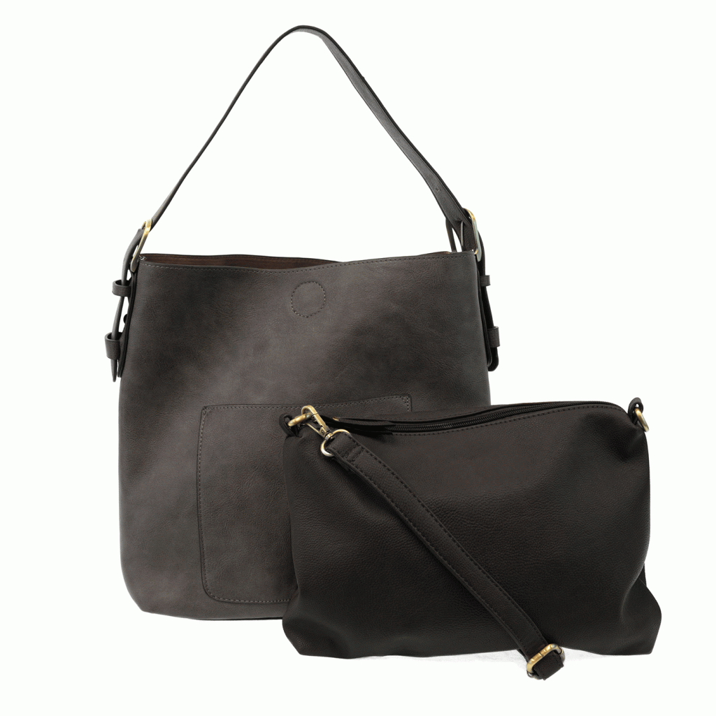 Equally timeless and modern, our best-selling classic hobo is made in rich vegan leather in beautiful colors always accented with neutral straps.  This roomy bag accented with a large front pocket and a snap-in removable crossbody, has plenty of room to carry your needs in style.