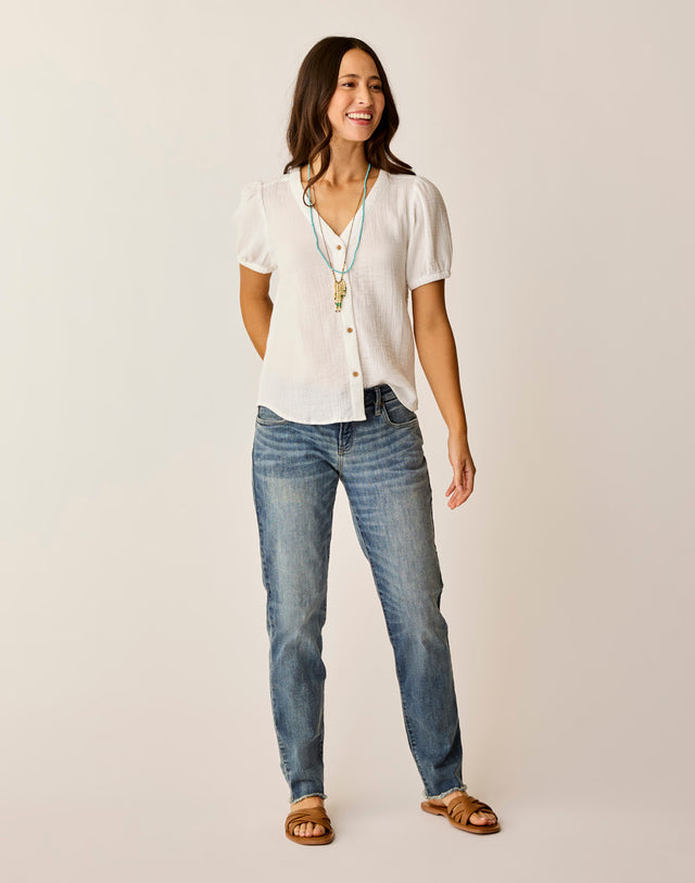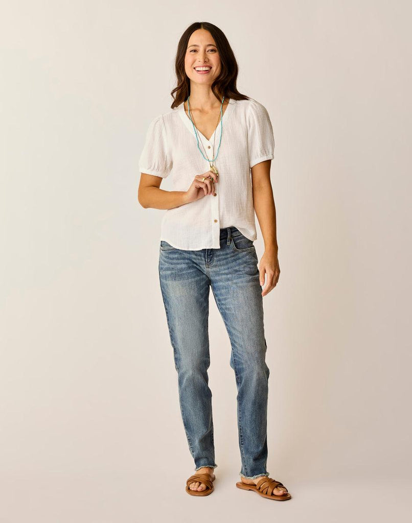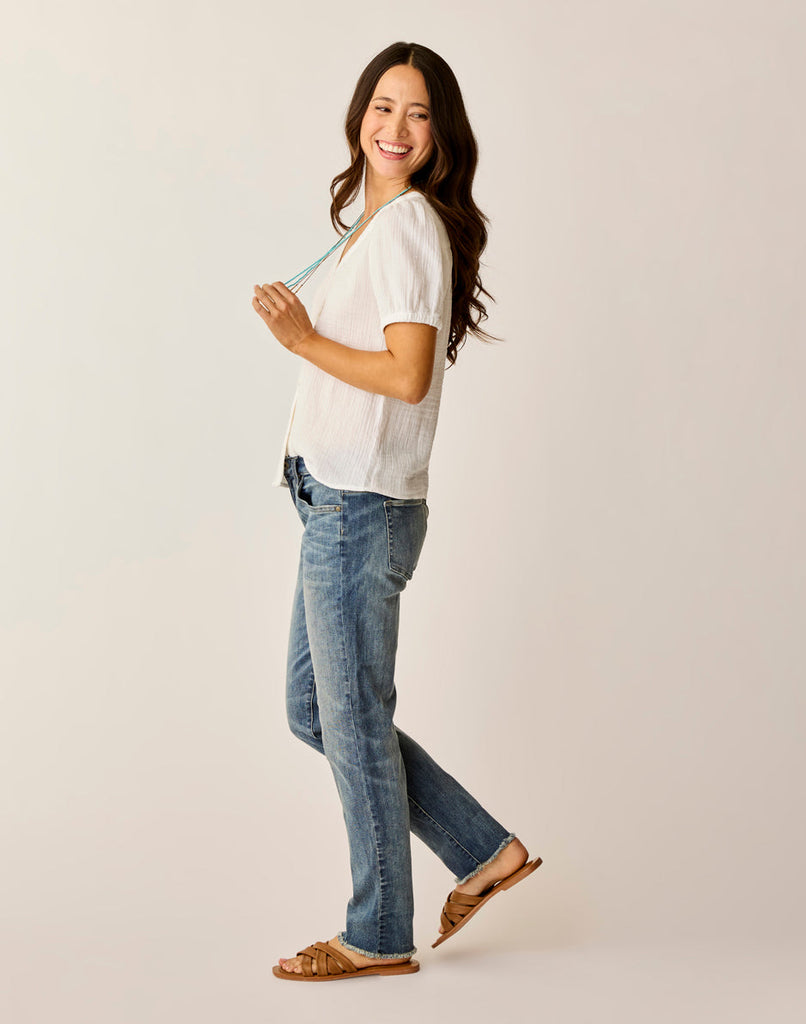 A slimmed down spin on the boyfriend cut, the best selling Carson is everything you want a good pair of jeans to be. Mid rise, relaxed with a little stretch. Wear them cuffed for a cropped length or rock the raw hem and longer inseam.