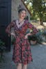 Colleen Dress in Jardinier Print by Effie's Heart. This stretch cotton knit, fit & flare beauty is in a beautiful Batik-inspired floral pattern and features three quarter sleeves with ruched detail at the sleeve hem, a flattering gathered surplice bodice with Queen Anne neckline, a full swingy knee length skirt...AND it has pockets!